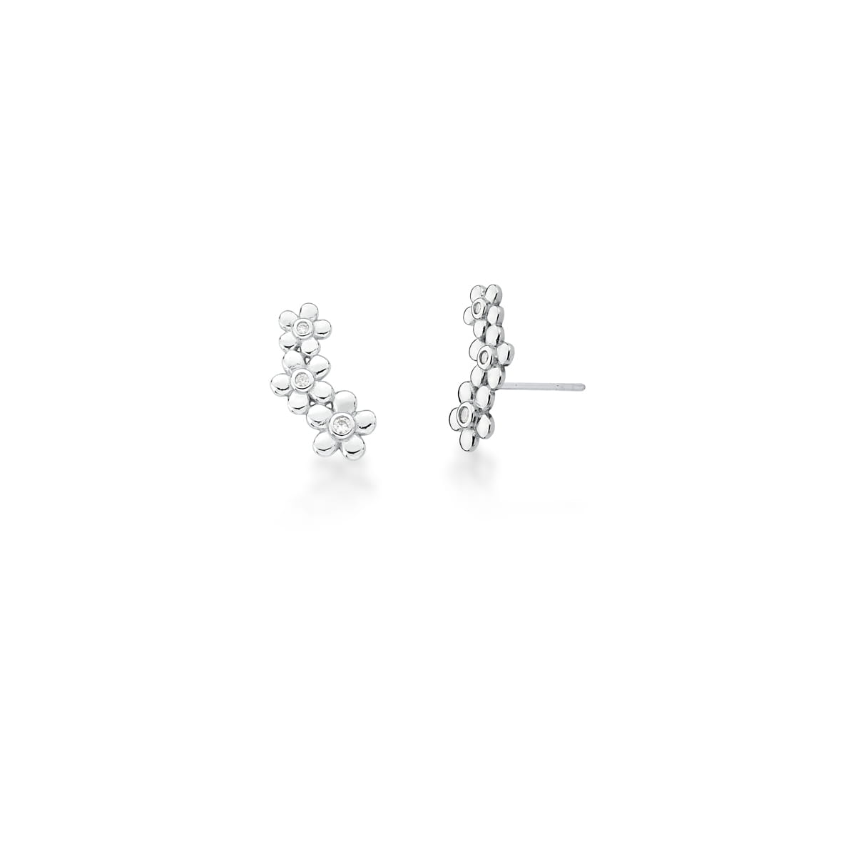 Brinco ear cuff com flores lisas cravejado com zircônias brancas.