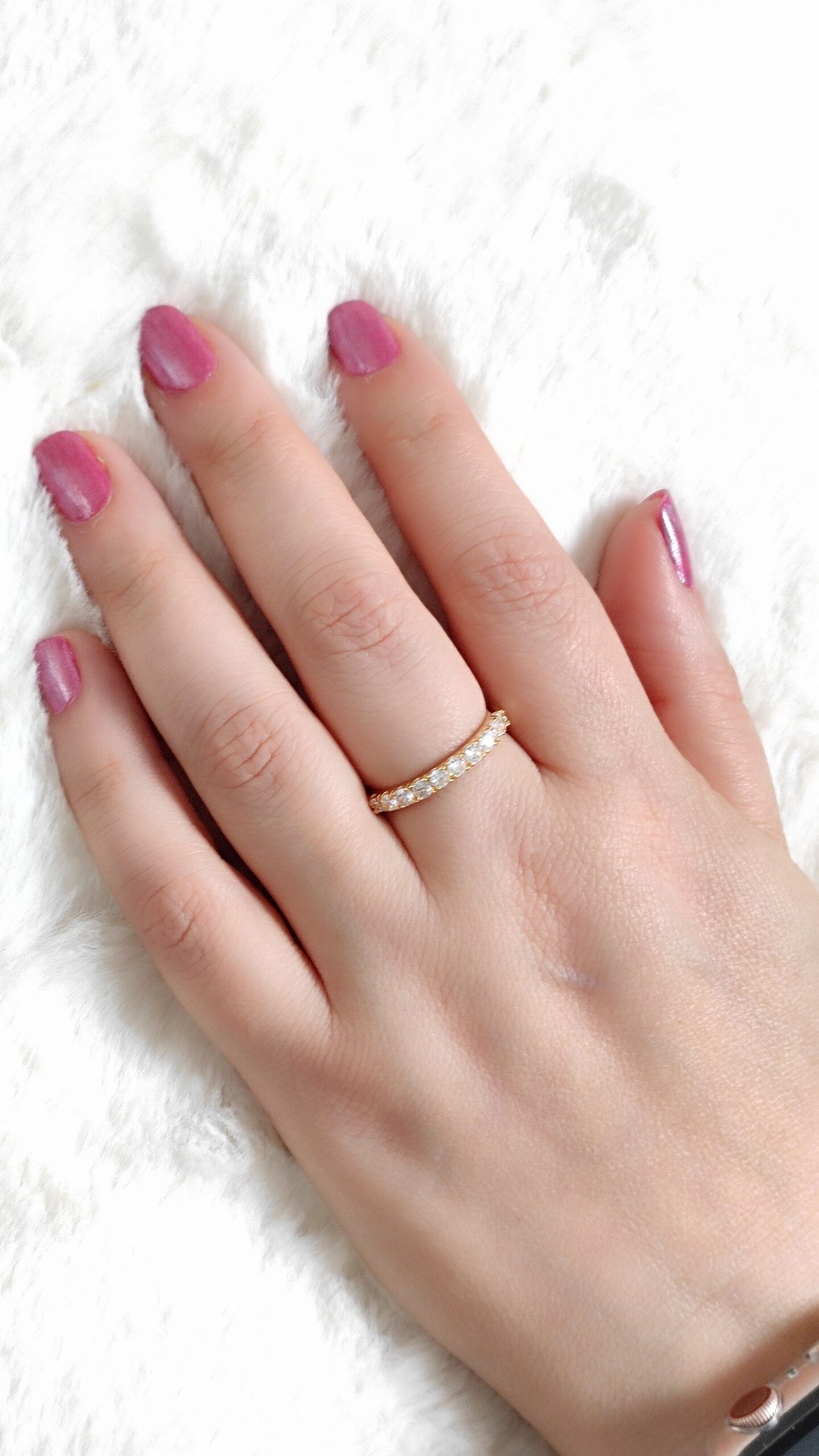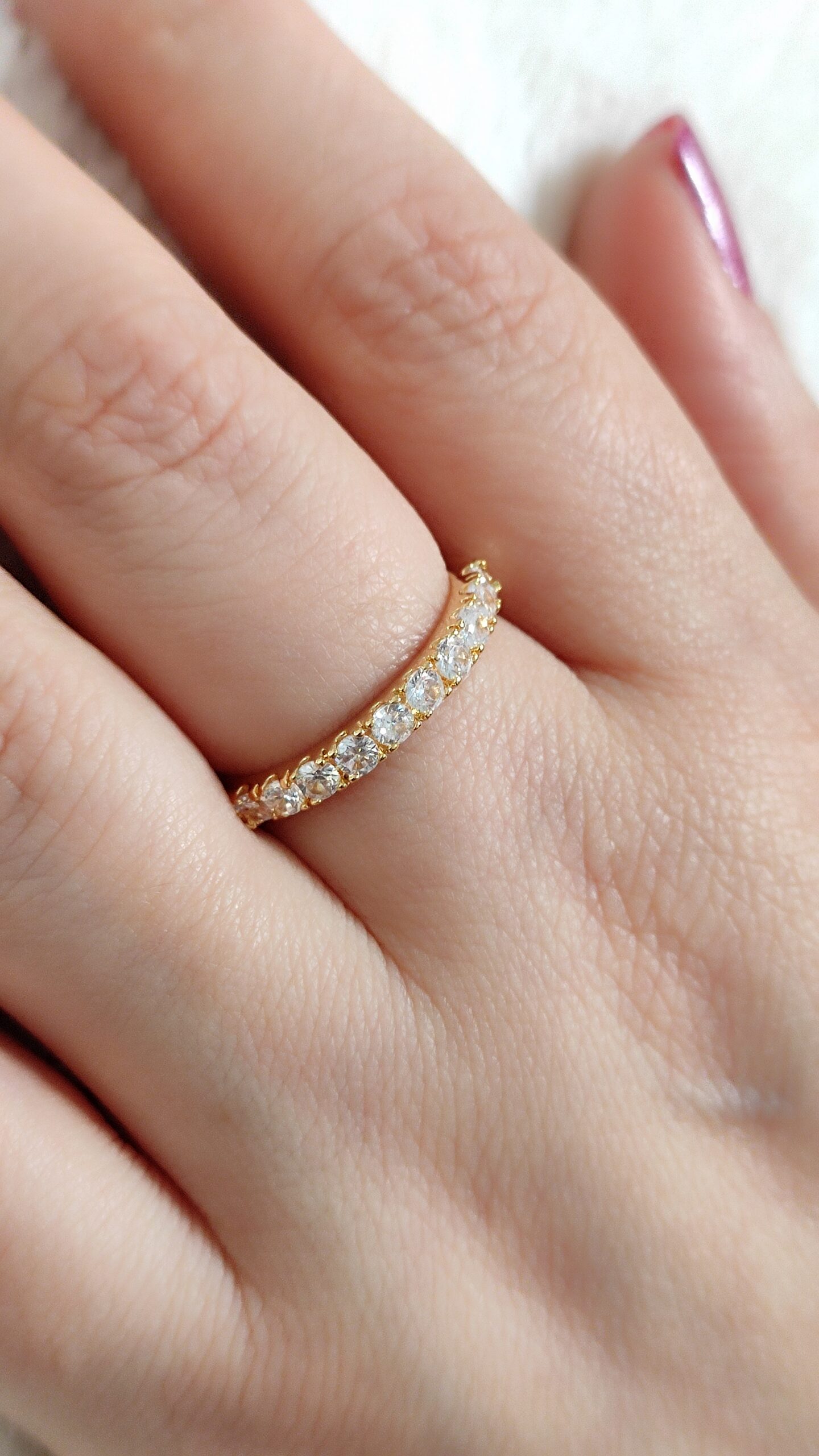 Anel banhado a ouro com uma fileira cravejada com zircônias redondas brancas, esse modelo é super delicado e cheio de charme.