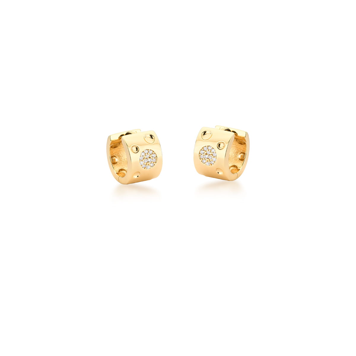 Argola com zircônias brancas com formatos redondos banhada a ouro.