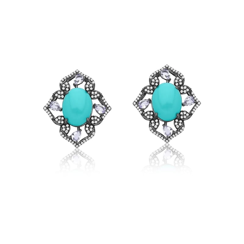 BRINCO FLOR COM CABOCHÃO OVAL/TURQUESA FOLHEADO A RÓDIO NEGRO