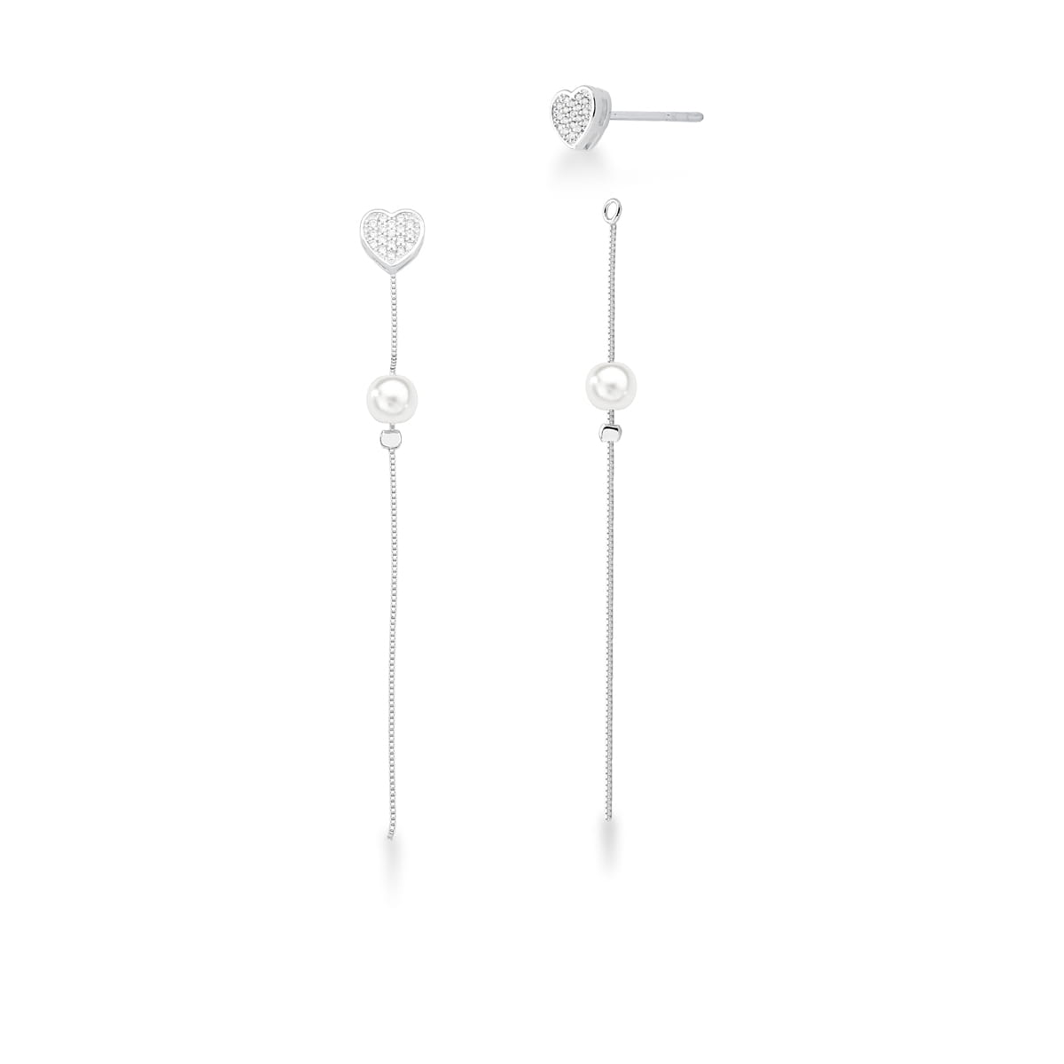 Brinco pêndulo 2 em 1 de coração com zircônias brancas e pérola shell prata 925 lisa.