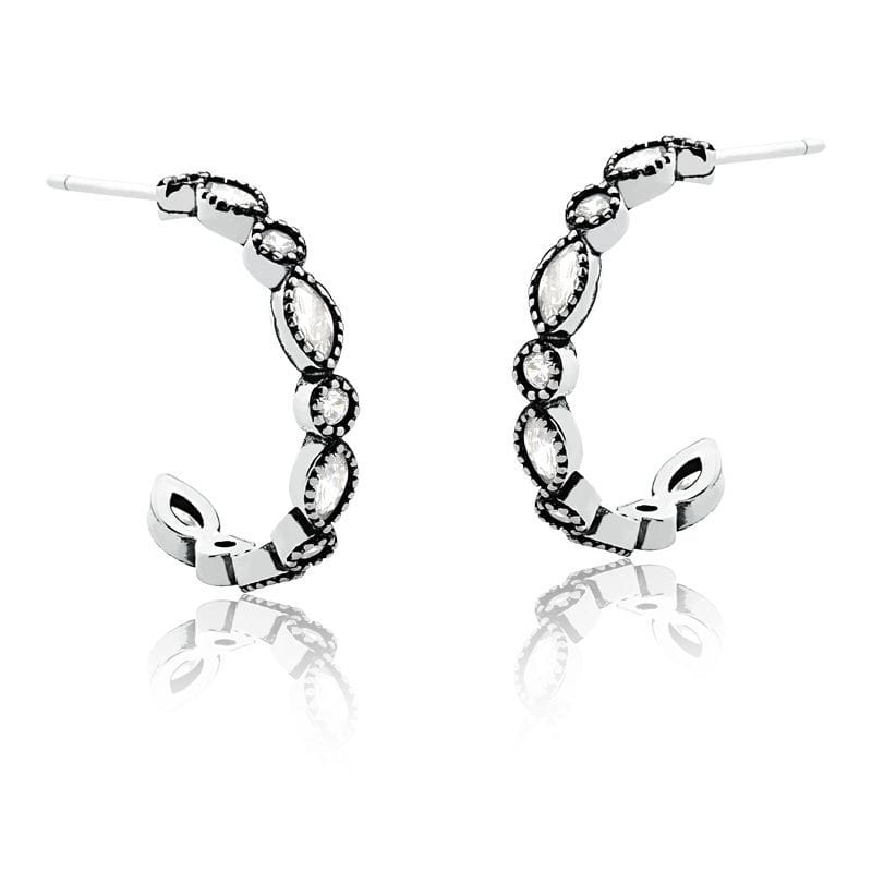 Meia argola com zircônias navetes e redondas na cor branca.